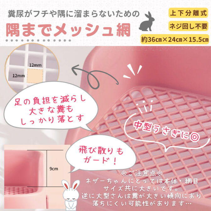 ✅【ほど良い幅のメッシュ網を隅までしっかりと】 ミニうさぎさんにぴったりです♪ウサギさんの足の負担を減らしつつ、大きな糞もしっかり落ちる幅です。 また糞尿がフチや隅にたまらないように隅までしっかりとメッシュ網があります。