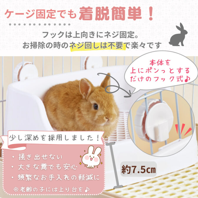 ✅【ケージ固定でも着脱を簡単に】 うさぎにトイレをひっくり返されたら大変… とはいえケージ固定のネジ留めを毎日つけたり外したりもまた大変です。